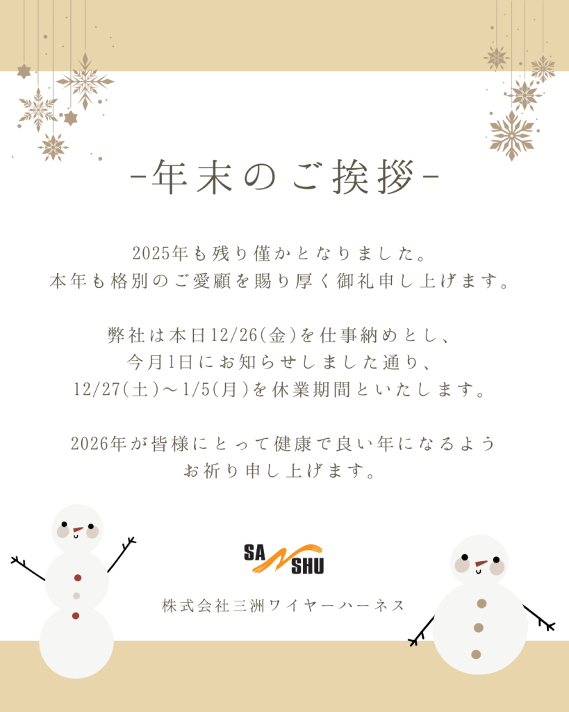 年末のご挨拶 2025年も残り僅かとなりました。本年も格別のご愛顧を賜り厚く御礼申し上げます。 弊社は本日12/26(金)を仕事納めとし、今月1日にお知らせしました通り、12/27(土)〜1/5(月)を休業期間といたします。 2026年が皆様にとって健康で良い年になるようお祈り申し上げます。 一覧へ戻る